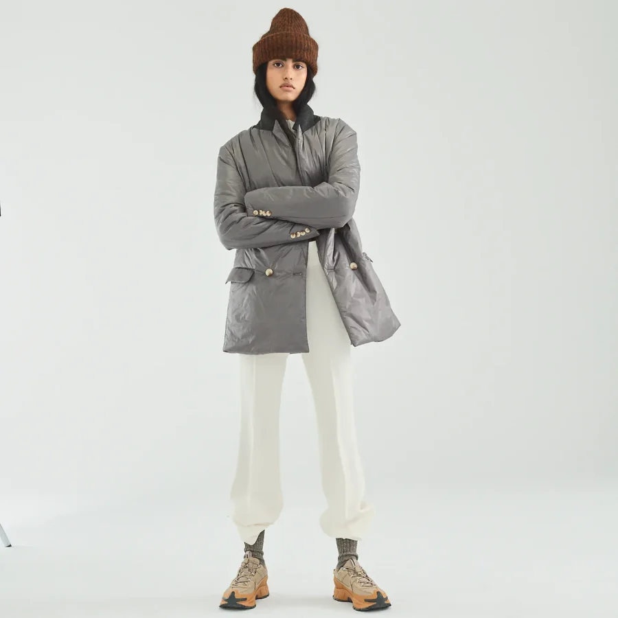 Founded by Dinah Luxton in Toronto in 2019, Luxton endeavoured to make winter enjoyable by creating what was essentially a superwarm quilted jumpsuit. In a semi-glossy black material with high-density down stuffing, it is stylish, too. Now, the brand has extended to silhouettes like a puffer blazer and a mixed-material cropped puffer insulated with 100 per cent plant-based fill with a shell that riffs off the original jumpsuit’s diamond quilting, not to mention fresh versions of the down snowsuit, like a sleek dove-grey version.