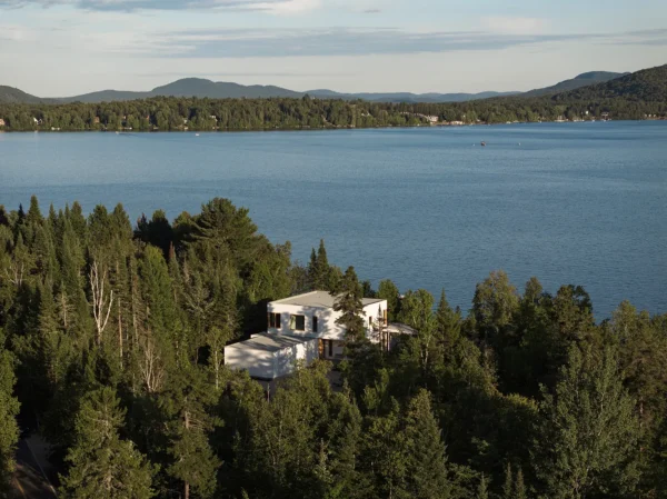 A red sand beach might not be high on the list of features you’d expect to find in rural Quebec, but that is what the site for this home designed by Ghoche Architecte offered. It sits on the shore of Lac Archambault in the village of Saint-Donat, which is flanked by a second large lake, Ouareau, on the other side. The surrounding Lanaudière area is popular year-round for skiing, hiking, and water sports.