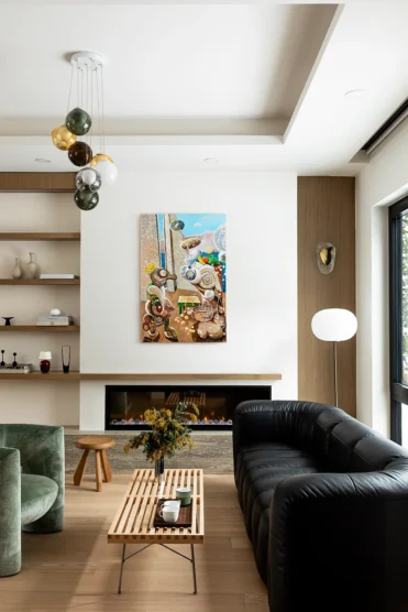 Furnishings and art also complement one another to offer points of visual interest throughout the space. “We treated art as a focal point,” Wang says. “Subtle pops of blue, green, and red in the art draw the eye and introduce a dynamic energy. We echoed these hues throughout the furniture and accessories, creating a cohesive and considered composition.” In the kitchen, a black-and-white palette offers a sense of contrast that conveys a minimalist feel against warm wood floors. Integrated panels hide appliances, maintaining a sense of architectural purity.