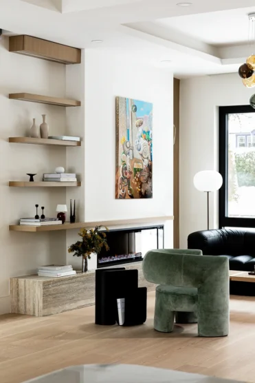To create a base of warmth and character, Atelier Fēn selected a restrained palette of natural materials consisting of white oak, travertine stone, plaster, and matte black and bronze accents. “Oak forms the foundation flooring, millwork, and furniture and was chosen for its warmth, durability, and timeless character,” she says. “Soft greys and neutral stones complement it, while natural plaster walls give depth to the light.”