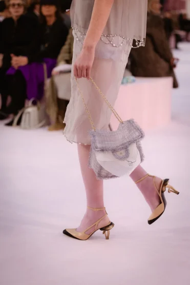 The looks that followed—including a pair of jeans and a white tank top—flowed like lingerie around the body in mousseline so fine that even through multiple layers you could still see skin. Even the Chanel 2.55 handbag was a glorious see-through objet. Blazy’s choice of mousseline was a deliberate nod to Mademoiselle Chanel: she was the first couturier to use mousseline as a standalone fabric, liberating it from its decorative role.