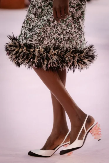 After the usual parade of daywear, with models of different ages, the collection really took flight. There were feathers, tweed coats, cocktail suits, sleeveless sheaths, beaded dresses, and a velvet blue two-piece pant look that offered a counterpoint to the collection’s prevailing lightness. The final, signature look departed from the expectations of a classic couture wedding dress with Blazy presenting an oversized collared shirt and knee-length skirt made of mother-of-pearl scales. Shoes throughout the show translated the set into something wearable with mushroom heels.
