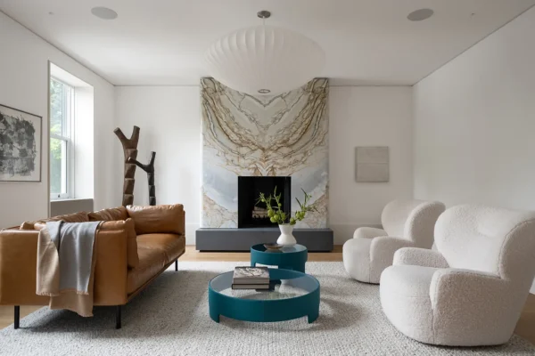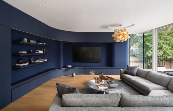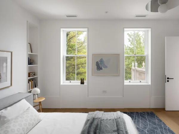 The back of the house tells a different story. Here, a sinuous two-story glass addition conveys a decidedly contemporary character as it makes space for a new family room and kitchen on the ground floor and a primary suite upstairs. Thoughtful detailing helps ease the transition between old and new, with contemporary elements mimicking the geometry of the heritage ones. “This approach embodies a rich layering of ideas that sees material, proportion, and craft come together, to create an architectural language that’s respectful of history and forward-thinking in spirit,” Petricone says.