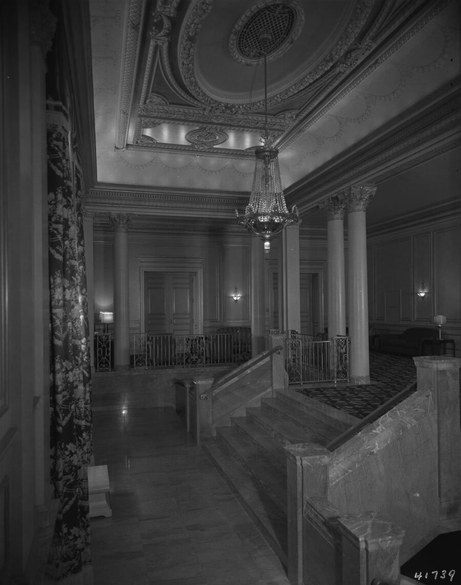 The grand staircase at the Fairmont Hotel Vancouver, 1939.