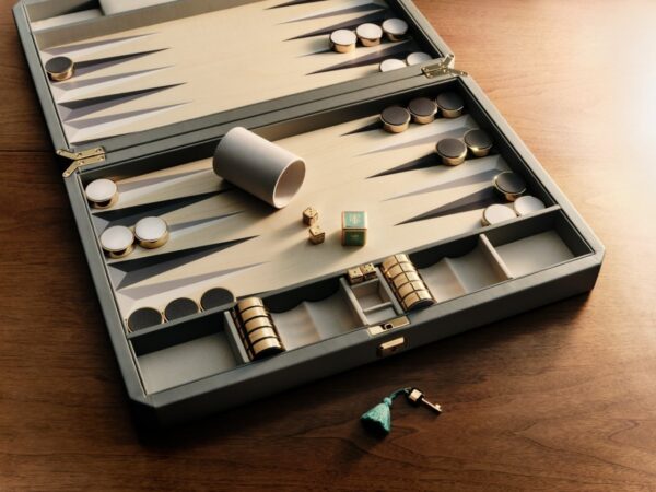 The colour of the case holding this backgammon set is the only clue you need to who made it. The iconic blue of Tiffany and Co. may be more familiar on jewellery, but here the case is manufactured to look like a cut gemstone. Inside, the light-blue motif continues. The case is manufactured to look like a cut gemstone, and inside the light blue motif continues on half of the pieces, the pips of the dice, and the doubling cube.