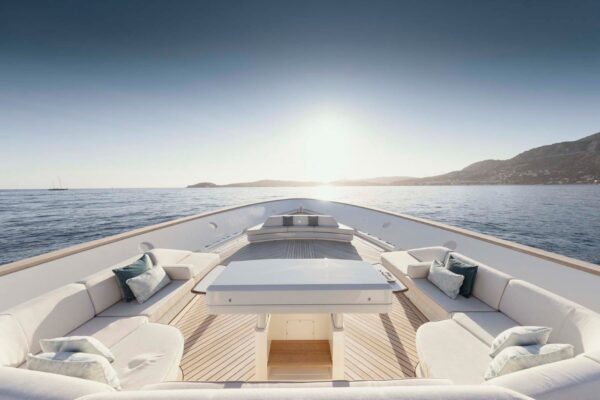 Throughout, the yacht’s decor is largely neutral, with the main deck salon featuring off-white sofas and armchairs arranged as two L-shaped seating areas. When evening comes, there is ambient lighting built into the bottom of the walls and furniture.