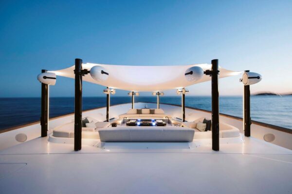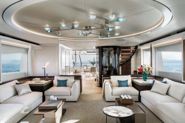 Superlatives also abound in describing the yacht’s basic structure. The boat has six decks in all, with an onboard three-person pneumatic glass elevator linking the primary living spaces on the main deck, the upper deck, and the bridge deck levels. A floating spiral staircase in dark and light wood wraps around the elevator like a helical snake for more leisurely passage between interior decks.