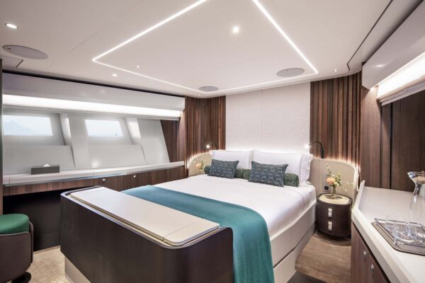 Windows with panoramic views can be found in the master suite, located forward on the main deck and accessed by a separate entrance. Custom artwork and twinkling LED lights above the bed add a unique, personalized touch.