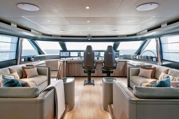 Instead of a deck with views of the cockpit, the mezzanine aboard this yacht offers comfortable seating to look aft or ahead to the dining area.