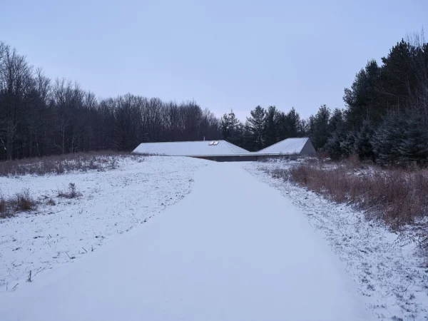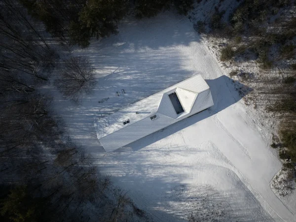 Ridge House‘s distinctive roof is a reminder of the sloped landscape the home is set upon, at the boundary between a field and the edge of a forest. Superkül strategically used the shape of the land for privacy as well as to maximize the views, “optimizing visual and physical connections to the ironwood and pine forest at the edge of the clearing,” as the studio states.