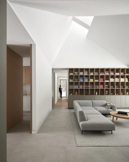 This indoor-outdoor connection is a strong focus throughout the architecture. Skylights along the vaulted ceiling fill the home with ample natural light and bring the outdoors in. The primary bathroom looks onto a courtyard in the centre of the home that provides an added vantage point onto nature. This courtyard is situated where the sloped roof dips and is demarcated by wooden slats, adding additional visual interest.