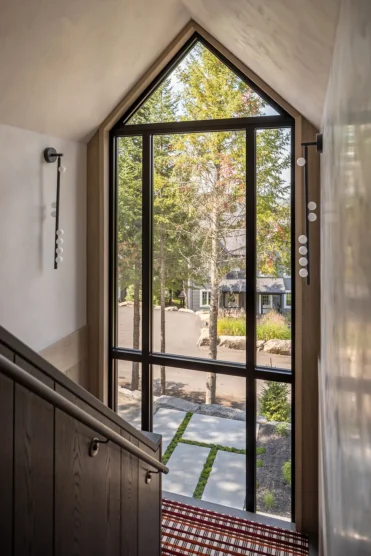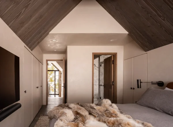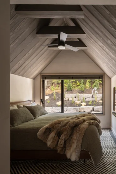 Upstairs, the home’s A-frame structure is expressed in the primary suite, where wood ceilings and exposed beams bring a rustic quality to the space. “The necessity of a high-pitched roof for snow shedding became an expressive design element,” he says of the decision to embrace this existing element of the home.
