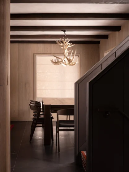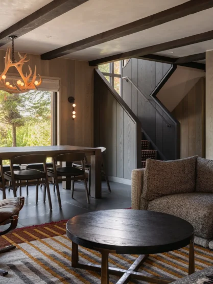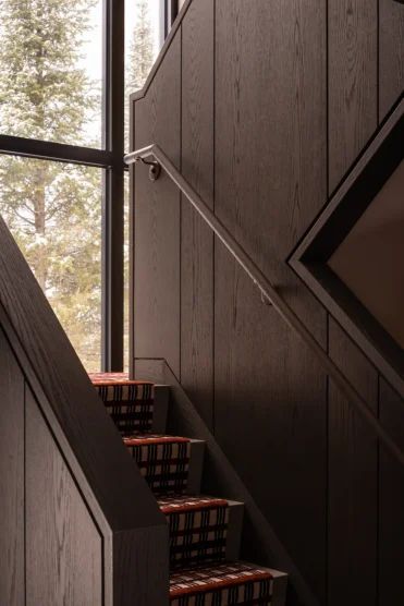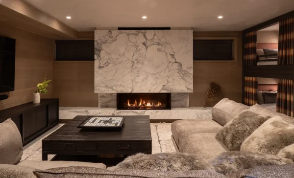 He points to dramatic textured and cerused oak for the flooring and kitchen millwork, as well as the raw, expressive black-and-white quartzite used in the kitchen, as contributing to the chalet’s mountain sensibility. Rugged stone floors in the living area complement the stone-clad fireplace, which stands as the heart of the home. “We chose a lot of textured wood to invoke a sense of warmth while referring to ski chalet typologies of the region,” Chan says. “A harmonious blend of rustic materials including wood and stone reflects the alpine environment.”