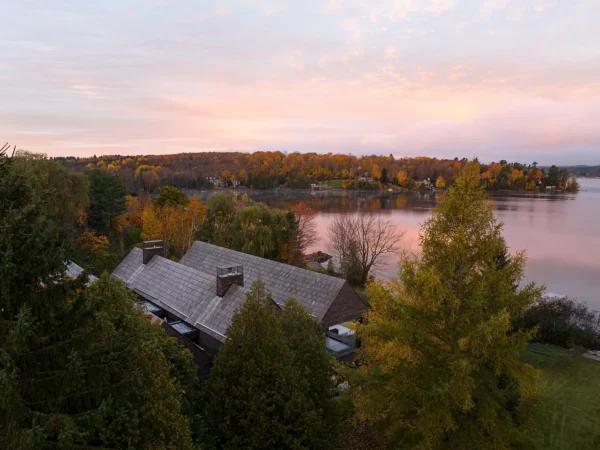 The home is split into four sections, almost “mini-barns,” stacked in order one by one from the lakeside, forming a sort of accordion when viewed from above, to allow the front of the structure to take full advantage of the sunsets over Lake Memphremagog, which spans the international border with neighbouring Vermont. Of the four sections, the one closest to the lake is the “summer home,” a terrace space with an outdoor kitchen and heated pool. One back is the “winter home” with the kitchen, dining room, lounge, and piano bar for when the nights draw in, followed by the “living quarter” containing the master suite, office, wine cellar, pantry, and powder room, and finally the “guest quarter” with five bedrooms.
