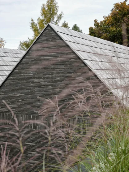 Whereas the farmers of yesteryear connected their disparate buildings with a long roof, Atelier Échelle has linked the four sections of the home with glass bridges and consistent material choices. The exterior walls are clad in clay bricks from Denmark, while the pitched roofs feature shingles created in a local workshop. Clerestory windows allow natural light to flood into the home.