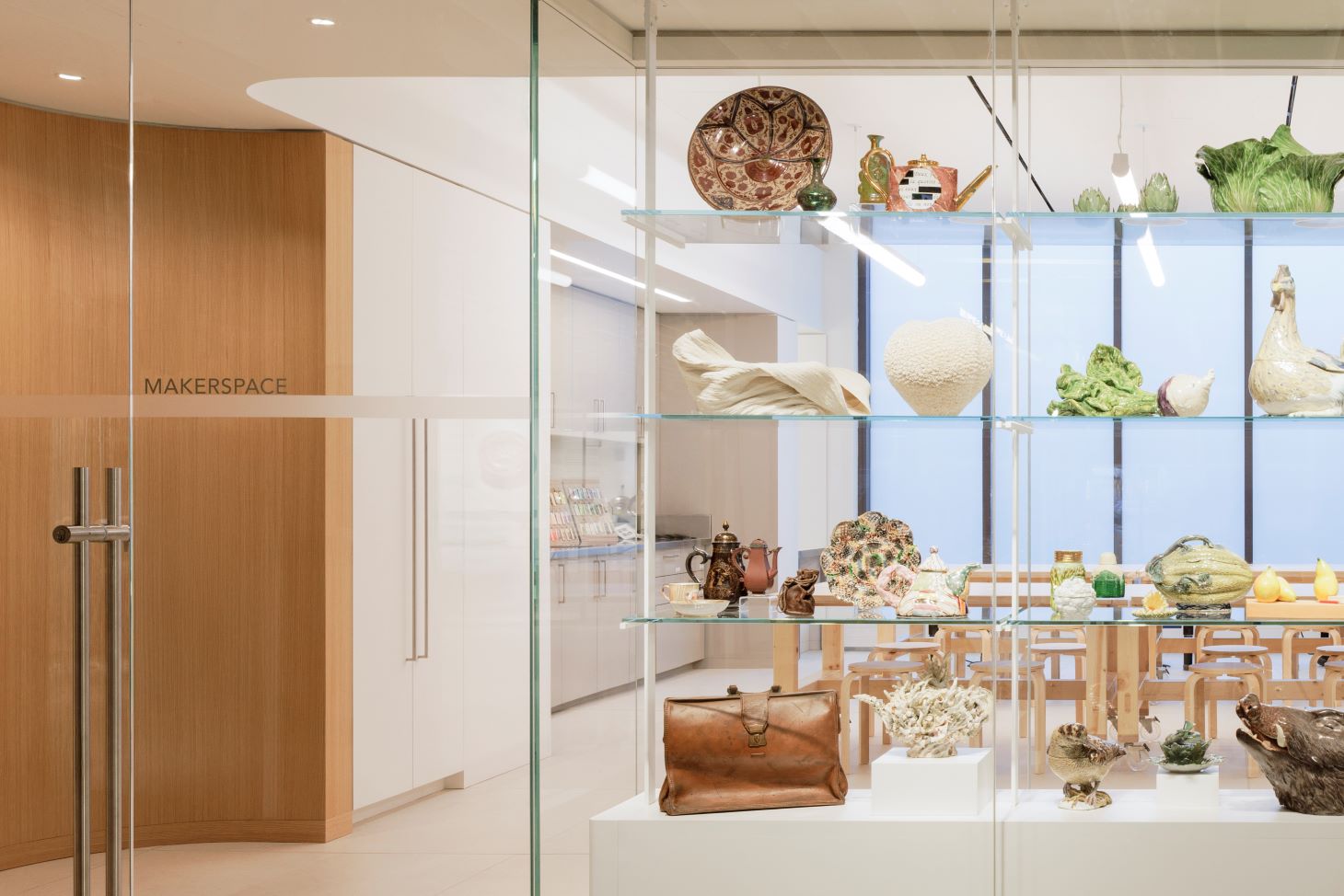 Snaking through the 9,000-square-foot ground floor, a wall of undulating glass gives guests a window into the new ceramics studio and community learning centre. “We love thinking of the museum as a community living room,” says Sequoia Miller, chief curator and deputy director at the Gardiner Museum. “In a more particular way, we think of the new community learning centre as a third space—not work, not home—that can hold complex conversations, speculation, and learning.”
