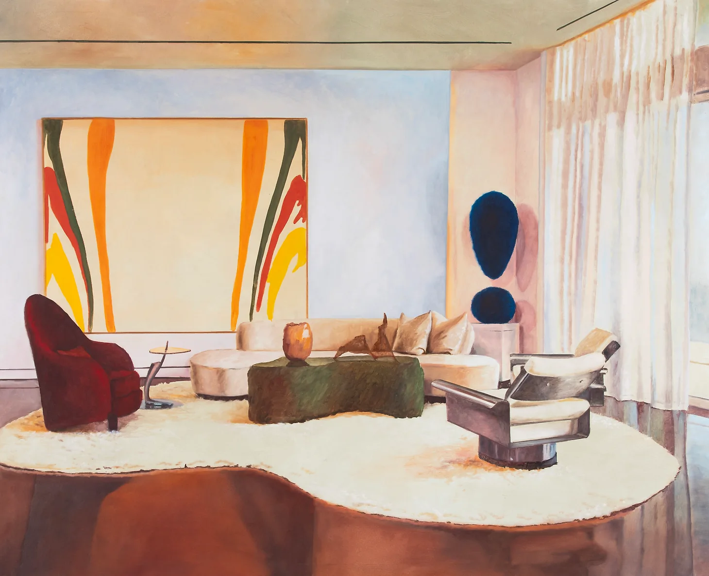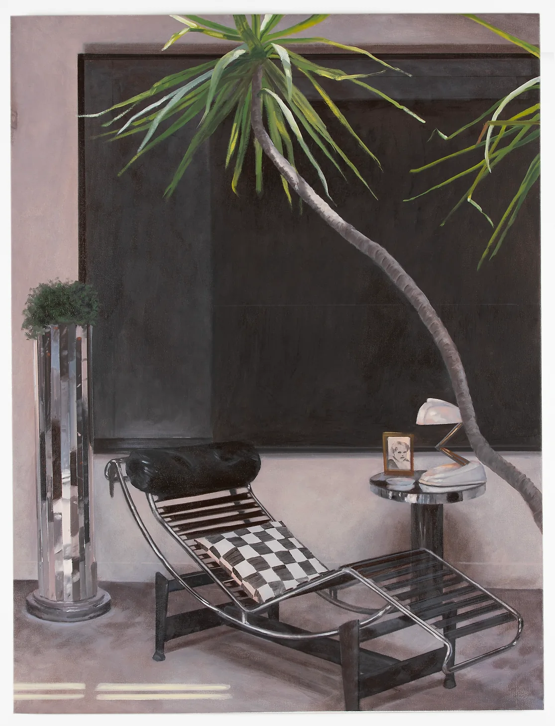 I try looking at Rideout’s canvases and imagining what thing I might belatedly notice if I were to live with them. Truth be told, when I first encountered his works, it didn’t immediately click for me that many contained one or more modernist masterpieces hiding in plain sight. Perhaps I’m so accustomed to seeing Twomblys and Picassos in museums, aloft in empty white cubes, that it didn’t register when they appeared in domestic settings. Or maybe they just blended in with all the other status-signifying decor in the rooms: the Eames lounger, the Panton chairs, the architecture itself.