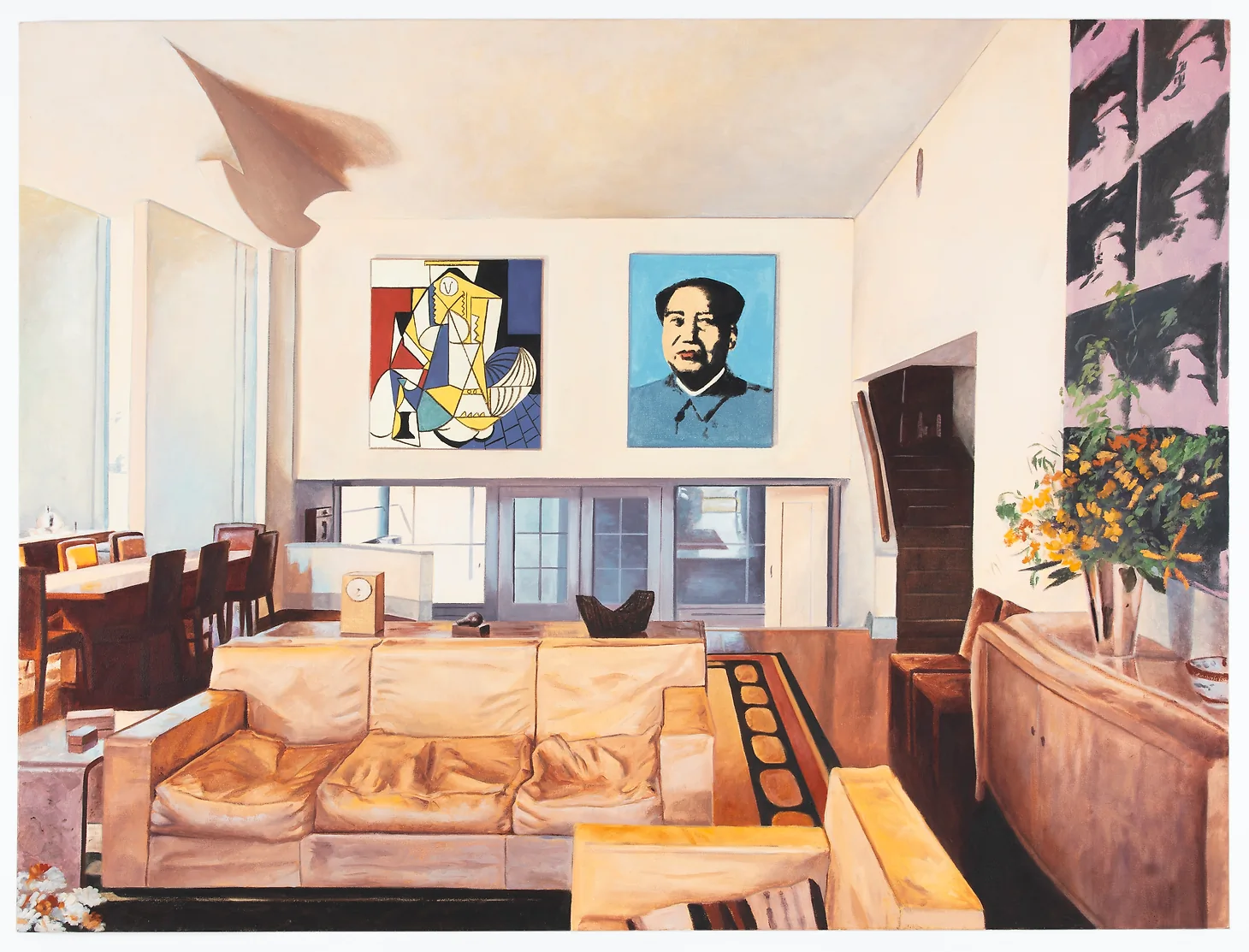 For his American Collection Paintings, Rideout often sources images from the internet, hunts down the vintage printed matter in which they first appeared, and then paints the rooms depicted at a large scale. The motif uniting many of the scenes is the conspicuous placement of important modernist artworks by giants such as Mark Rothko, Henri Matisse, and Francis Bacon.
