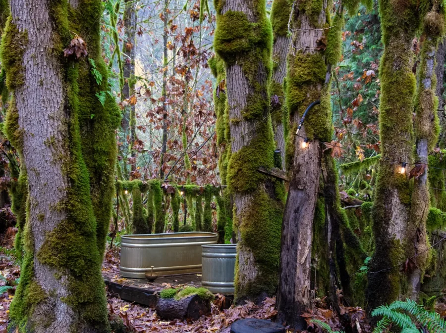 A raised platform nearby holds two cold plunge tubs beneath a broadleaf maple canopy, completing the thermal cycle. Between rounds, guests retreat to a cosy yurt strung with fairy lights, a quiet space for rest and reflection, stocked with herbal tea, water, and meditation aids.